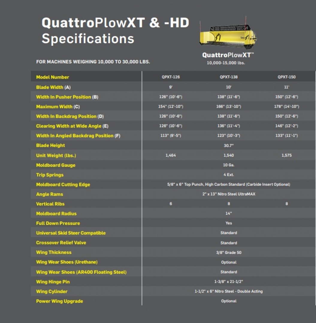 Built for heavier weight equipment, the QuattroPlowXT features all the benefits of the original QuattroPlow®. A member of a new class of snow plows, this autowing plow automatically switches between angle plowing, wide-angle plowing, pushing, and backdragging with no electrical controls or ever having to chase a detachable box.